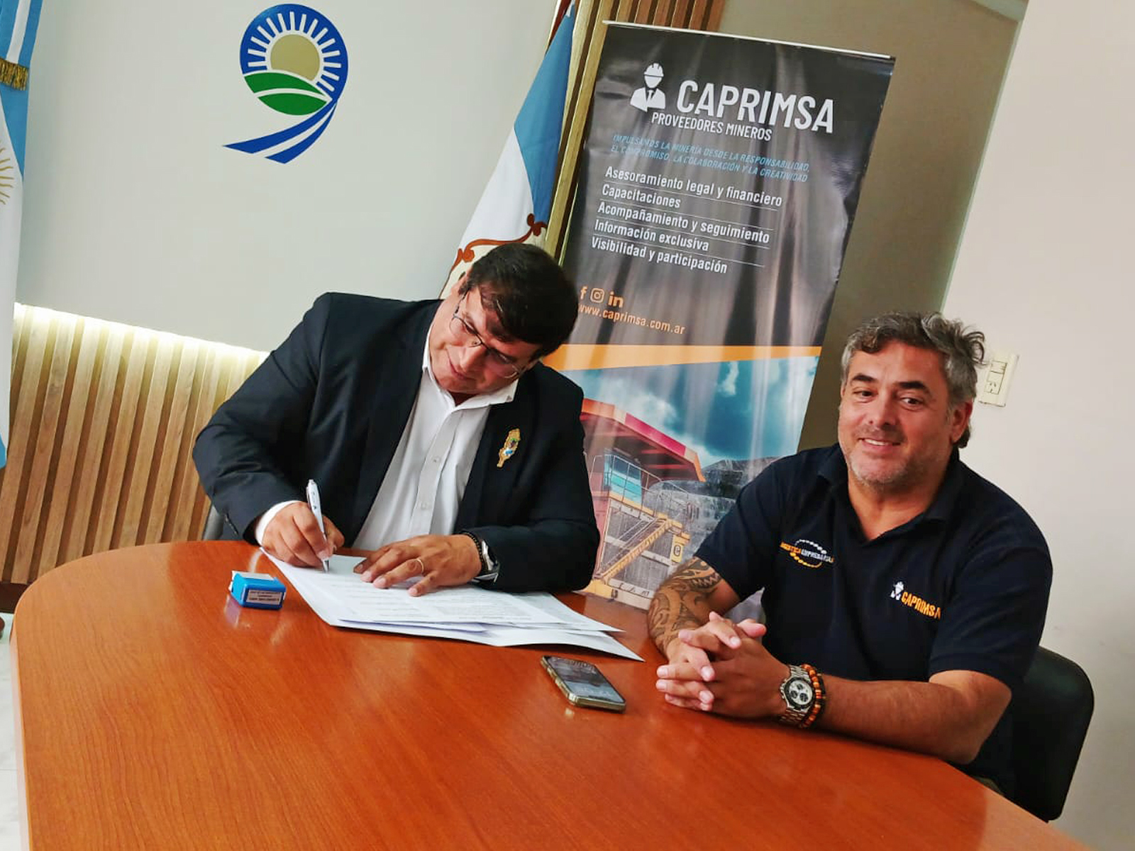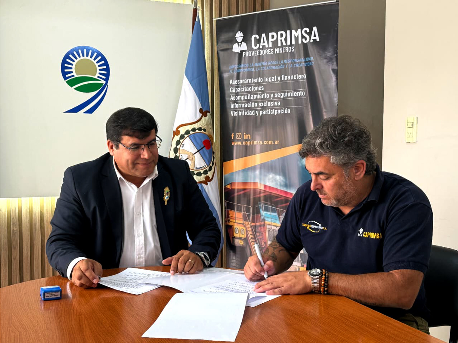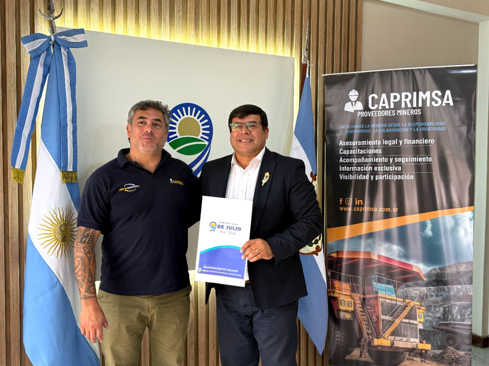 La Municipalidad de 9 de Julio y la Cámara de Proveedores Interdepartamentales Mineros de San Juan (CAPRIMSA) establecieron el pasado miércoles 11 de marzo un Convenio Marco de Cooperación Institucional destinado a promover acciones conjuntas que fortalezcan la articulación entre empresas y el gobierno municipal. El acuerdo fue firmado por Daniel Banega, intendente del departamento junto a Fernando Godoy, presidente de CAPRIMSA.
